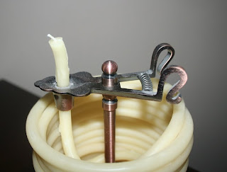 (The beeswax candle is pulled up through the clip and when the candle burns down to the clip, the girl's suitor must leave.)